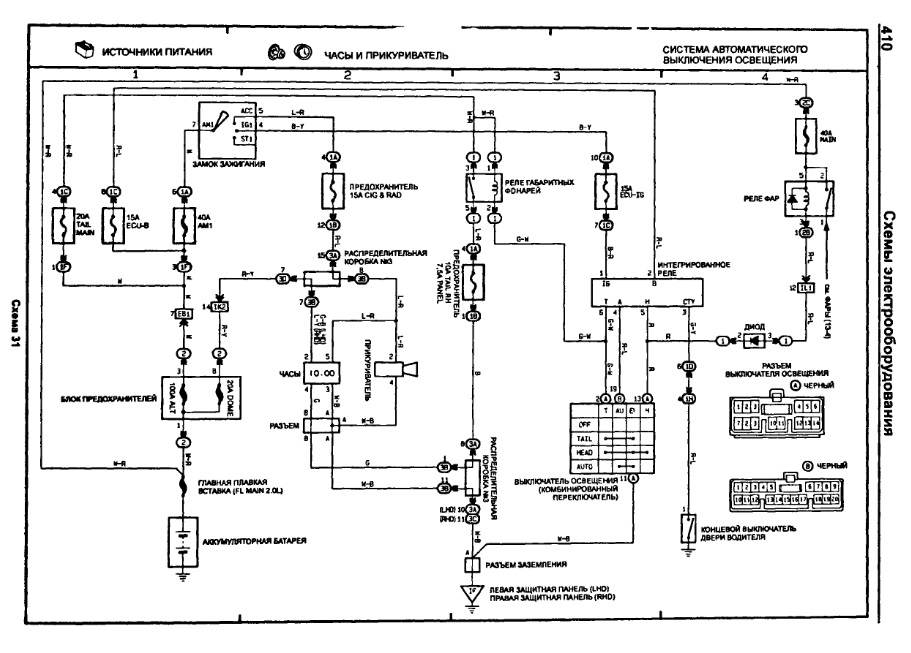 Так там сигналка подключена - там все скручено ппц как, висят 4 предохранителя, но это чуть глубже, за блоком с предохранителями, а вот контакты от подрулевых переключателей идут в фишку для соединения, большую такую фишку, и до нее никаких скруток я не обнаружил, значит где то дальше блин(((( Medved писал(а): При включении габаритов обычно кроме прикуривателя обязана включаться подсветка приборки и центральной консоли(печки- климата). Да, все верно - это включается. Но это все включалось в положении ACC ключа зажигания точно с момента покупки машины. Значит колхоз был до меня. Вот сижу схемы курю. Действительно подсветка включается от габаритов. А вот схемы, на которой сказано, как что делается в положении ACC ключа зажигания, я хрен нашел. Объясните на какой схеме мне искать то, куда идут провода от положения ACC, потому что на схемах показано, что ключ зажигания замыкает/размыкает цепь для стартера. А мне надо понять какие провода куда идут от зажигания. Видать, после поворота ключа в положение acc - ток подается на габариты включая их. Вопрос еще такого плана. Сигналка. При постановки/снятии с нее - она включает фары и габариты - из-за этого и есть вся проблема. В какую цепь включается сигналка, что она включает фары? Получается она встраивается между переключателем и реле фар, тем самым подавая ток на реле - включает фары и габариты?