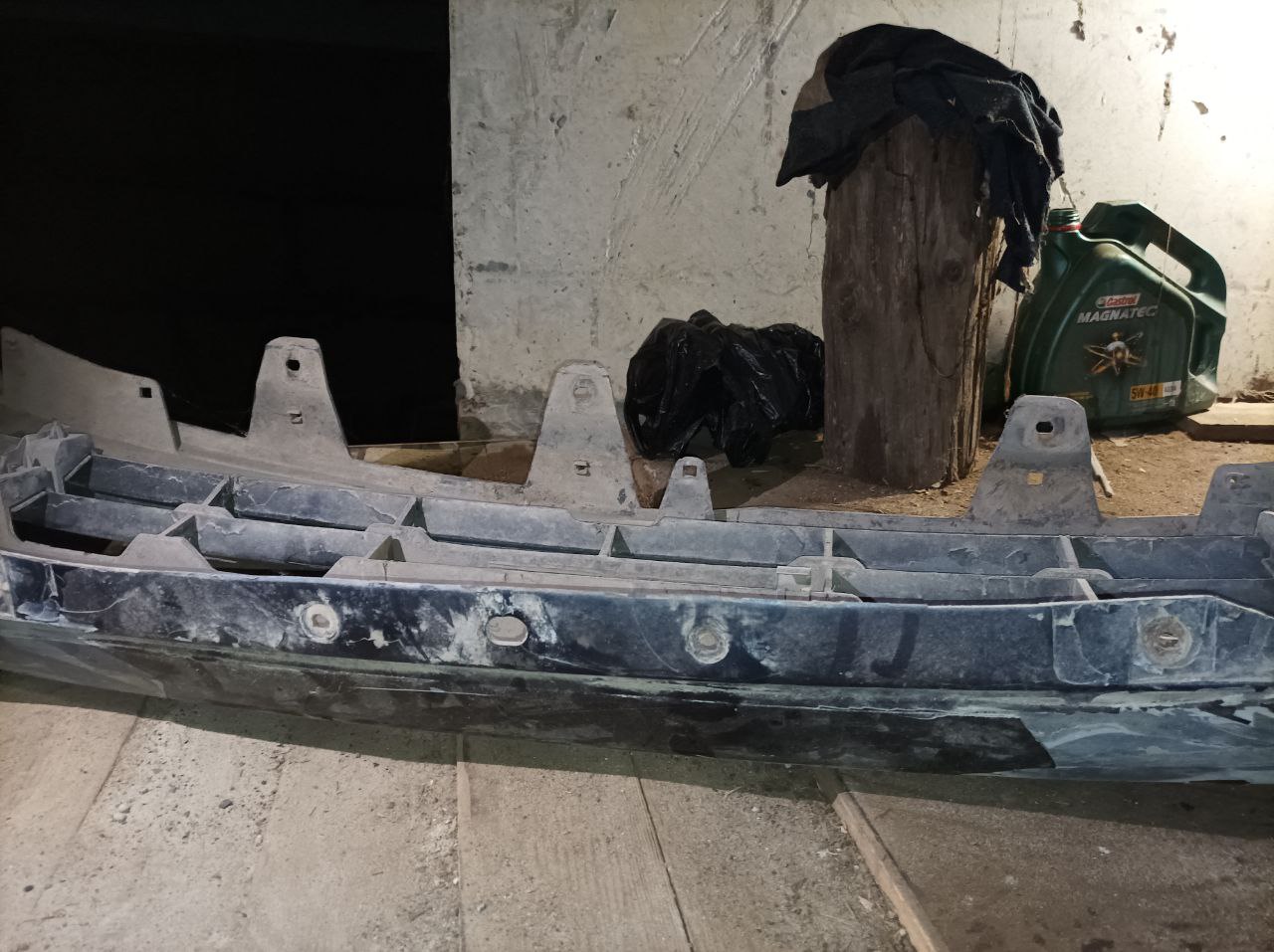 2. Передний бампер (вроде оригинальный) под рихтовку/покраску, с отверстиями под омыватели фар и с заглушками в туманках. Пара креплений сломаны но, в целом, всё в порядке.