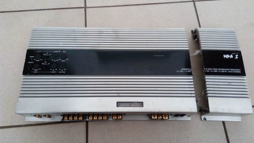 Итак начну историю установки звука в своей Каринке. В машине при покупке стоит бюджетная голова Pioner DEH1600, буквы не помню, с одним выходом тюльпанов и 4-мя динамиками - хорошими, по уверению бывшего хозяина, в дверях.. Фронт вел себя действительно достойно, даже бас выдавал, в отличии от тыла, но как всегда хорошего мало и мне не хватат! Хочу бас а не мид бас, хочу еще громкости на любимых напевах! Был куплен занедорого 5-ти канальный усилок, еще немецкий, Blaupunkt MPA5 Коротко характеристики: 4*100+ 1*220 правильных человеческих Ватт звука. Когда примерял его к машине, понял что он не только под сиденье не лез, но и в багажник вертикально - с трудом, его длинна оказалась аж 500 мм Но при анальном досмотре нового девайса было обнаружено сало в виде пустой части корпуса .. И тогда было задумано принести его в жертву моим стремлениям не красть места в багажнике ... Крышку снял, заклеил скотчем плату и засунул усилок в бальшую ленточную пилу, минуту делов и алюмишка располовинелась, крышку обрезал на плазме, потом засверлил под родные саморезы торцевой заглуши и перествил ее. Края обработал напильником Смотрим слайды Вложение: