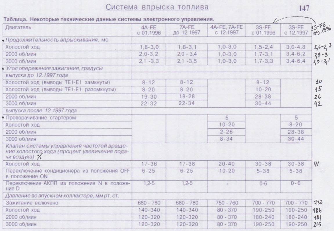 Fidel У меня 3S-FE, 2.0, 3D, АКП, A540H, 1997 г. Выбег не знаю, я вот с этой таблицей сравниваю, но с каким столбцом не знаю. Некоторые параметры не могу даже определить. Помогите, пожалуйста.