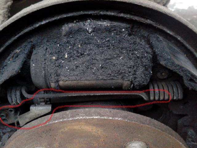 iron_klg Скорее всего вышла из строя система развода колодок. На фотке отметил как она выглядит. часто закисает, после чего колодки перестают разводиться при их истирании, что выливается в ослабший ручник и слабое торможение. Сама по себе она не сложная, так что когда снимешь барабаны, то разберешься.