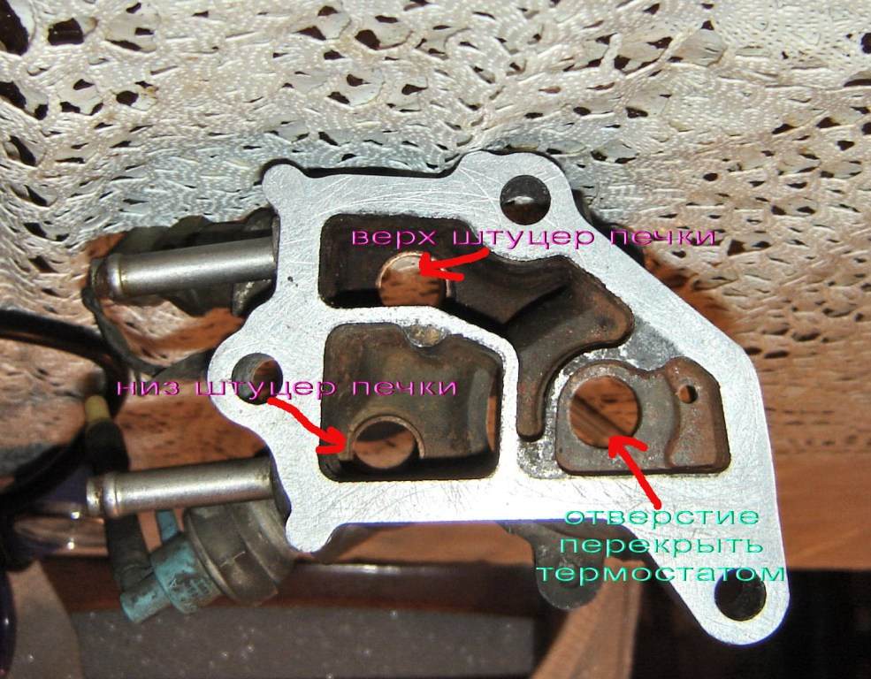 Azamat_630 писал(а): С верхнего патрубка от двигателя он должен быть подключен к нижнему патрубку радиатора печки _юрок_ писал(а): поток тосола идет на печку по верхнему (на рисунке) штуцеру вот и причина, поставив другой термостат, Юрок изменил просто направление циркуляции ОЖ в корпусе термостата и стало хорошо, но это не надолго может быть А если поставить обычный термостат с монтажной глубиной 33 мм и переставить шланги, то и с ним также будет все хорошо и безопасно.