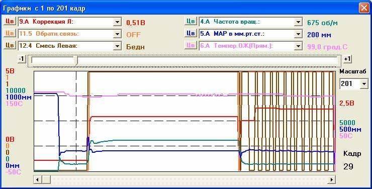 Виктор77 писал(а): почему не получается скачать Отправил мылом  Enakin писал(а): 3.А Клапан ХХ(% от 255): - енто что за парам У тойоты есть несколько типов клапанов ХХ. - Есть на базе шагового двигателя. Там шагов от 0 до 125. Именно эти шаги и выводятся в протокол - Есть КХХ соленоидного типа, у нас такой. Там измеряется Idle Duty, что-то вроде степени открытия, измеряется в процентах. В протоколе 100% соответствует значению 255. Соответственно нам и выбирать надо КХХ (% от 255). Нормой считается значение на прогретом ХХ - до 40%, если выше, то надо запланировать промывку клапана  - КХХ (% от 125) - этот параметр на всякий случай придумал chem407, чтобы запутать вас всех нафик  Очень рекомендую для изучения матчасти Тойоты ее же учебник - http://carinae.denser.ru/forum/viewtopi ... =10&t=2877Добавлено спустя 4 минуты 41 секунду:Enakin писал(а): На кой по букварю если график все показывает, или ты думаешь что прожка не успевает ? Конечно не успевает. За 10 секунд где-то 8 кадров. А для 8 циклов лямбды (бедная/богатая) нужно хотя бы 16. А лучше еще больше. Так что цешку и букварь в руки