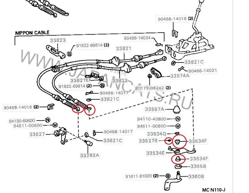 Вот как я лечил люфт и плохое включение второй (иногда с хрустом) Заменил втулки рычага выбора передач, сухарик, который был истерт. Бушинги тросов поменял на подшипники. Залил ATF в коробку. Теперь все скорости включаются четко без хрустов, остался не большой люфт в кулисе, но это не напрягает. На картинке отметил красным.