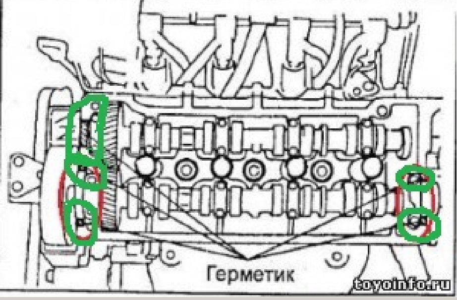 Всем привет. Манул пишет что нужно нанести герметик в обозначенных местах. А куда его наносить? В одном месте сальник распредвала, во втором уплотнительное кольцо распределителя....