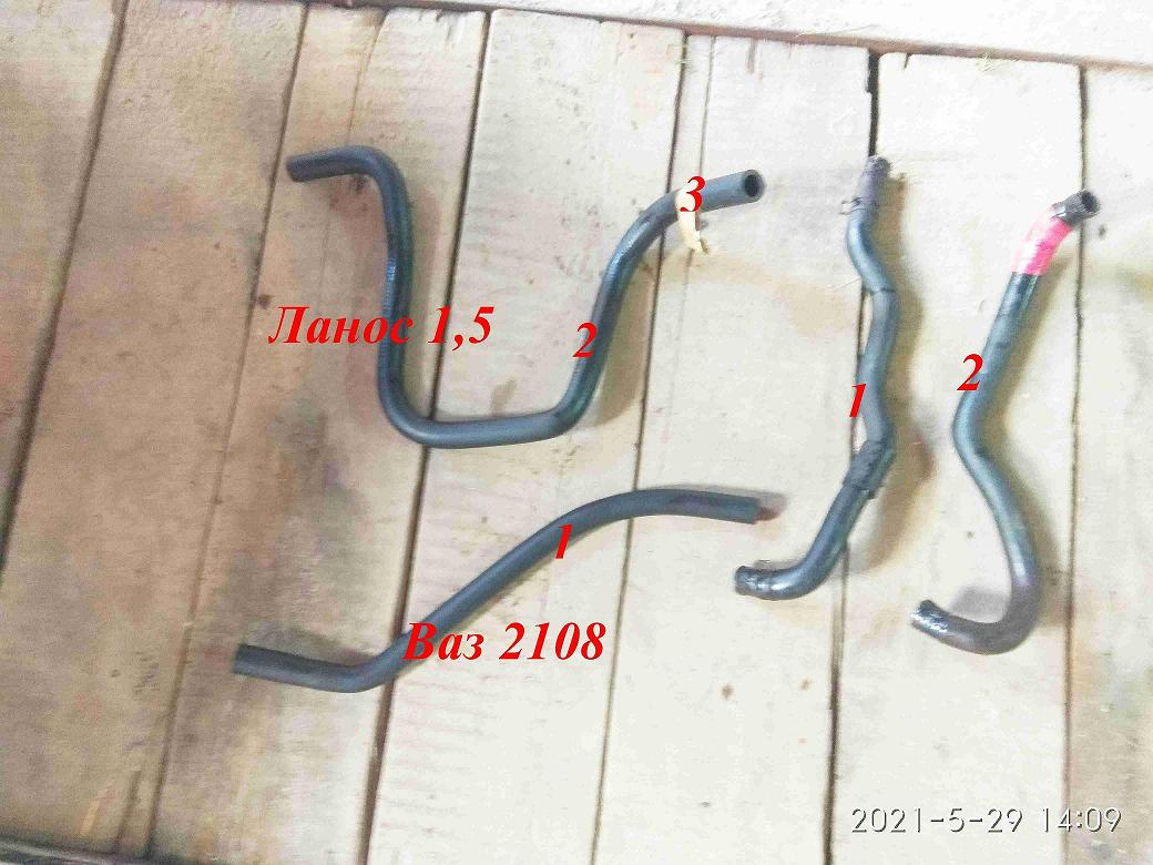 Добрый день Патрубки на отопитель заменил. Как и писал выше, сделал шаблоны из проволоки. Из чего выбрал: Ваз 2108-99 - самый длинный патрубок. Брал в наборе 2шт. (производитель HORT). Стоимость 3,0 бакса. Отдельно (не из набора) такой патрубок был на 3 см короче. Мне он показался впритык, поэтому взял набором. Использовал из набора один патрубок, обрезал со стороны утолщения 1см. У меня он обозначен №1, прямой, от блока к печке. Ланос 1,5 - кривой патрубок (производство Корея, армированный). Стоимость 4,0 бакса. Из него получилось 2 патрубка. Патрубки у меня обозначены №2 и №3. От блока до краника №2, от краника до печки №3. Еще брал литр антифриза 3,6 бакса При замене патрубков антифриз не сливал. Машину поставил под наклоном (зад ниже). При снятии патрубков что-то вылилось в корыто. Подогнал патрубки, одел их со стороны печки. Залил, поочередно, в эти патрубки антифриз (примерно ушло 0,5л). И также поочередно одел патрубки со стороны блока. Завел авто, немого "погонял" двигатель. Печка греет. Общие траты 10,6 баксов