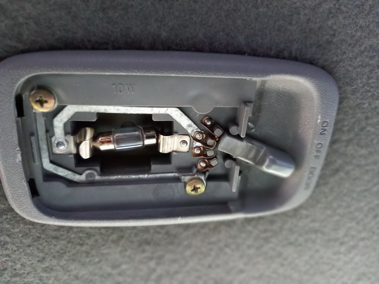 Армен-77 писал(а): Проблема в следующем… Лампа в салоне горит в крайних положениях и с закрытыми дверями и с открытыми, в нейтральном положении не светится соответственно. У нее 3 положения - ДООР(светим при открытии дверей), ОН(светим всегда), ОФФ (не светим никогда). По сути салонный центральный плафон дублирует лампочку на приборке в положении ДООР. Тихо мирно восстанавливаем лампу в приборке и проверяем концевики дверей. Проводка передних концевиков живет под пластиком центральных стоек, задняя прячется под боковыми батонами спинок заднего сидения. Последний концевик задней двери(багажника) у седанов и лифтов живет на замке в кузове, у вагона он в замке в двери.