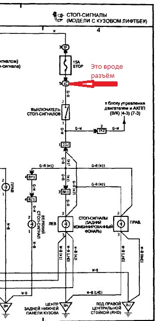 Возможно это кому то пригодится. Так же выражаю свою благодарность, в попытке помочь и разобраться мне ДмбИ так. По результатам следствие установило.... Я не знаю, как такое объяснить, наверное барабашка Толмуд Тойотовский на модели 92-98 г или врёт, или не подходит к моделям, скажем до 92 г. по электро схемам проводки. Авто у меня 89-92г Что установило следствие, по результатам проверки. А оно установило, что у меня по крайней мере нулевые познания в данном вопросе. После предохранителя сигнал идёт на выключатель и далее с него на реле. Почему так? На включателе тоненькие проводочки, явно не для тока в 10-15 ампер. То есть, не может через них идти ток на стопы. Далее, сигнал по проводу привёл к центральной консоли. Вот тут, начинается самое интересное. На авто с завода стояла АКПП, я брал уже с МКПП. У меня был вопрос в теме разъёмов, от чего они, там по видимому это от коробки автомат. Так вот, электрик сказал, что там должна была стоять релюха, разъём имеется, релюхи нет Далее с этого реле идёт сигнал, на другое, которое стоит в багажнике. Фото позже скину. А вот оно уже включает стопы, это со слов электрика. По схеме в толмуде, ни чего подобного нет. Вложение: