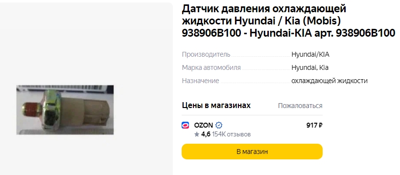 Вот, что-то нашёл: https://exist.ru/Price/?pcode=938906B100Надо бы изучить где и как он применяется... Добавлено спустя 9 минут 33 секунды:Re: Установка датчика давления в систему охлаждения двигателя.Череп писал(а): Надо делать все, что от нас зависит: проверить пропку, прочистить систему охлаждения от многолетних отложений, привести в порядок соединения и уплотнения патрубков. А там, как карта ляжет. Ну да, это всё понятно, тем не менее, поставили же многие дополнительно вольтметр для наблюдения за уровнем напряжения в бортовой сети при исправном генераторе, или тот же датчик температуры охлаждающей жидкости с цифровым отображением. Цель данного проекта - увидеть превышение давления в системе охлаждения при отказе работоспособности крышки радиатора.