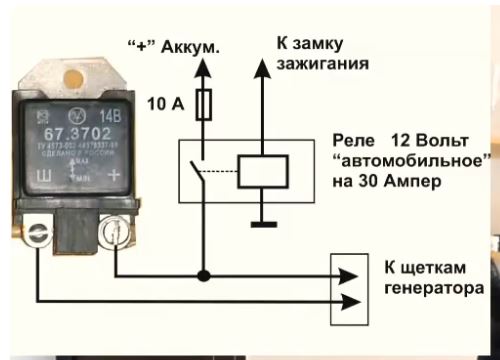 l_denisНашел вот такое видео. https://rutube.ru/video/87f85d1e3b43186 ... 60d66cf23/ вдруг поможет. l_denis писал(а): Если подключать выносной регулятор от ВАЗа, то нужно именно к щеткам цепляться и озолировать их от потрохов генератора. Там одна щетка на диодный мост законтачена, а на вторую + с регулятора подается. Если так, то контакт + на регуляторе нужно подключать к точке соединения моста и 1 из щеток через реле. Второй контакт регулятора на свободную щетку. Ну и корпус рега на корпус двигателя.
