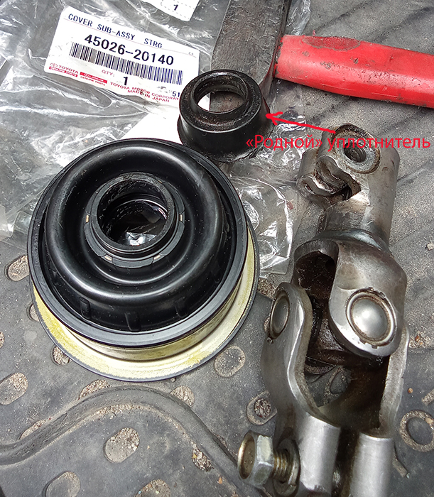 Причиной замены пыльника послужило появление шума двигателя в салоне, пыльник оказался порван в нескольких местах. 1. Перед началом работ, выставляем колеса и руль "прямо". 2. Так же рекомендуют отключать Airbag в руле, если таковой имеется. 3. Затем снимаем пластиковый щиток под рулем. 4. Для лучшего доступа к пациенту снимаем воздуховод- открутить всего один саморез 5. Откручиваем 2 болта в карданчике, я выкрутил полностью, без этого карданчик снять не мог. 6. Тяним карданчик вниз и снимаем его с вала. 7. Ослабляем хомут на пыльнике и легким движение снимаем пыльник с вала. 8. На Existe пыльник по непотребной цене от 1800р. Заказал от Coronы 45026-20140 за 600р. Так же говорят, что можно поставить жигулевский пыльник Шруса. 9. Пыльник от Короны точная копия нашего, но диаметр под рулевой вал в нем 20мм, а в нашем 16мм. Чтобы полностью исключить попадания шума в салон из вне, вырезал центральную часть из родного пыльника, поставил ее на вал и сверху надел новый пыльник. 10. Сборка в обратном порядке.