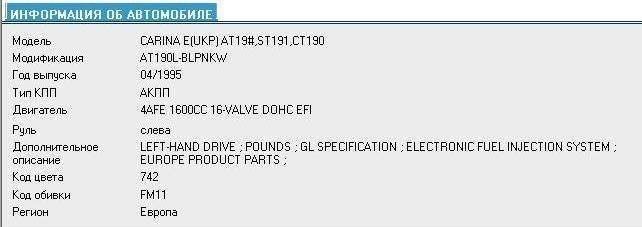 У тебя в подписи. Алексей Коннов писал(а): CARINA E(UKP), 4A-FE не LB, AT19#, ST191, CT190, AT190, автомат, слева, POUNDS, GL, EUROPE, 04/1995, цвет 742 Добавлено спустя 1 минуту 12 секунд:koljamba писал(а): Ещё имеется 115 сильный агрегат