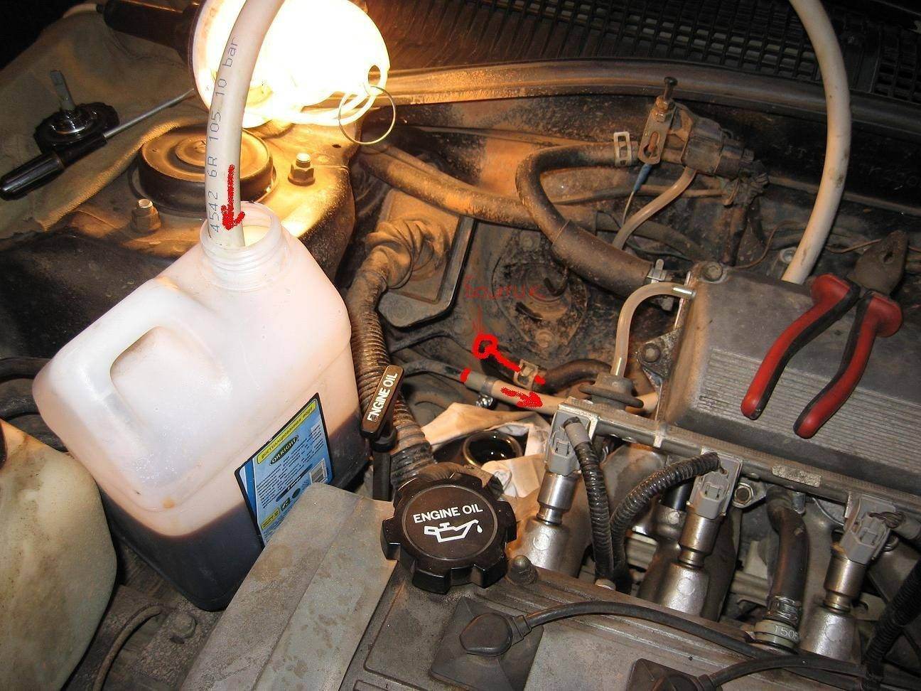 Вообще у меня была идея, штатный шланг не глушить, а снять его (он же на хомутике, и воткнуть туды (отрежу от того же использованного шланга) кусочек, и этот кусочек опустить в емкость с новой жижей. Вообще бы красота была. Просто шланг был 1 м, а есть 1,5 и 2 м, вообщем побоялся что отрежу и короткий будет на "слив". Но итак все чики-пуки получилось, я не бегал, яж написал тактично. По времени не более 30 мин.