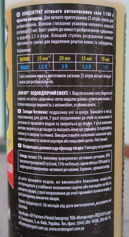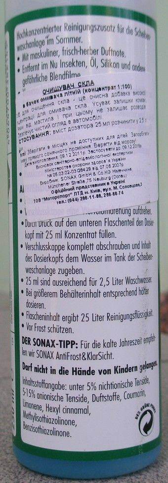 Отписываюсь по тестам моющих жидкостей: 1. Dmitry_R писал(а): Сейчас пользуюсь Омыватель стекол Антимуха LAVR Insect Cleaner Мух/комаров смывает очень плохо, первым взмахом размазывает по стеклу, потом около 10-15 взмахов, обильно поливая омывайкой, что бы отмыть след более-менее. Высохшая жидкость оставляет мутные следы на стекле. Запах не очень приятный. Моя оценка 3- (и то, только что бы не обижать Российского производителя) 2. Dmitry_R писал(а): Чешский SHERON SCREENWASH с эффектом Анти-дождь По мытью мух, свойства где-то близкие к "LAVR Insect Cleaner". Эффект Анти-дождь испытать не удалось, т.к. у меня стекло и так покрыто "Анти-дождем". Пока без оценки. 3. Dmitry_R писал(а): SONAX clear view 1:100 concentrate for men SONAX clear view 1:100 concentrate Apple-fresh Все свойства, заявленные производителем - выполняются. Следы от "свежих" насекомых смываются за 2 взмаха и одно нажатие на омыватель (не поверил, если бы сам вчера не видел) , стекло остается идеально чистым и прозрачным (ехал уже в темноте). Мутных следов высохшей жижи почти нет (ночью на стекле никаких разводов). Самые "трудные" пятна держатся не более чем до 5 взмахов. От знакомого на Аккорде, поступил отзыв, что за 2 взмаха смывает даже вчерашние (засохшие) следы от насекомых. Моя оценка 5. (хотел написать 5+, но оставлю "+" для следующих тестов.) 4. SONAX Xtreme clear view 1:100 concentrate NanoProhttp://www.sonax.com/Product-Search/(node)/12850/271141-SONAX-Xtreme-clear-view-1-100-concentrate-NanoProDmitry_R писал(а): Евген, там даже Экстримовский есть! (моющая способность +20%) http://www.exist.ru/price.aspx?pid=F6902529&sr=-4Этот концентрат уже пришел, ещё не тестировали, но уже и так понятно, что будет 100% не хуже предыдущего, производитель даже заявляет ещё более высокие характеристики.