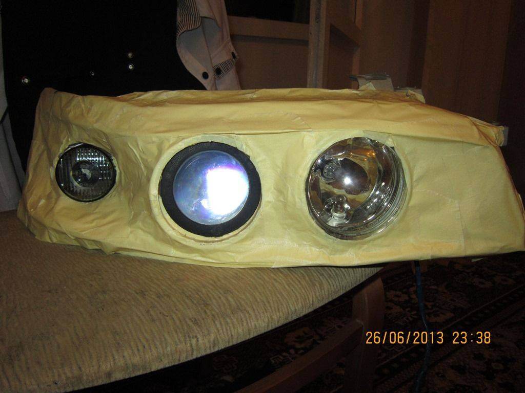 я тоже вставлю свои пять копеек так как свет свои фар меня не устраивал....как бы сказать что он их не устраивал, ну старые фары я выкинул в помойку даже не стал их оставлять на потом=) пока я без поездок, вот кромсаю машину вот первая примерка=)))))) откуда фары - большой секрет=)))    уже испорчен хороший капот, бампер, и два крыла, две фары депо легли смертью храбрых...кромсаем к чертовой матери =) смысл - взять и сделать моноблок из фар =)