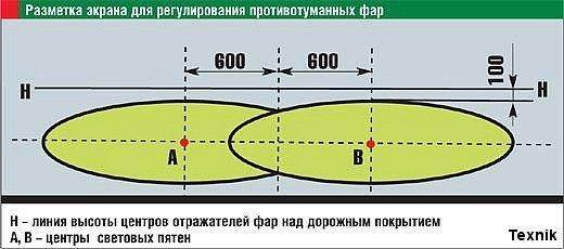 Регулировка противотуманок сводится к установке горизонтального и вертикального углов их положения. Самостоятельно регулировку удобно производить с помощью экрана с разметкой, поверхность которого должна быть перпендикулярна к рабочей площадке и находиться от машины на расстоянии 5 м. В качестве экрана может быть использована стена. Фары регулируют так, чтобы верхняя граница световых пятен совпадала на экране с горизонталью, проведенной на 100 мм ниже линии высоты центров фар, а расстояние между центрами их световых пятен составляло 1200 мм (см. рис.). Более точную регулировку фарной системы автомобиля можно произвести на СТО, используя реглоскоп (устройство, имеющее оптический измерительный узел).