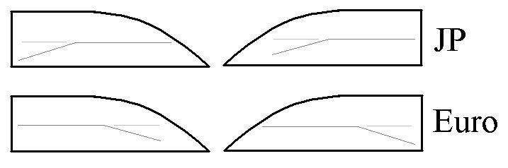 Нашел во дворе японку с рифленой фарой, сопоставил стекло с европейкой. То, что получилось схематично изобразил на рисунке.