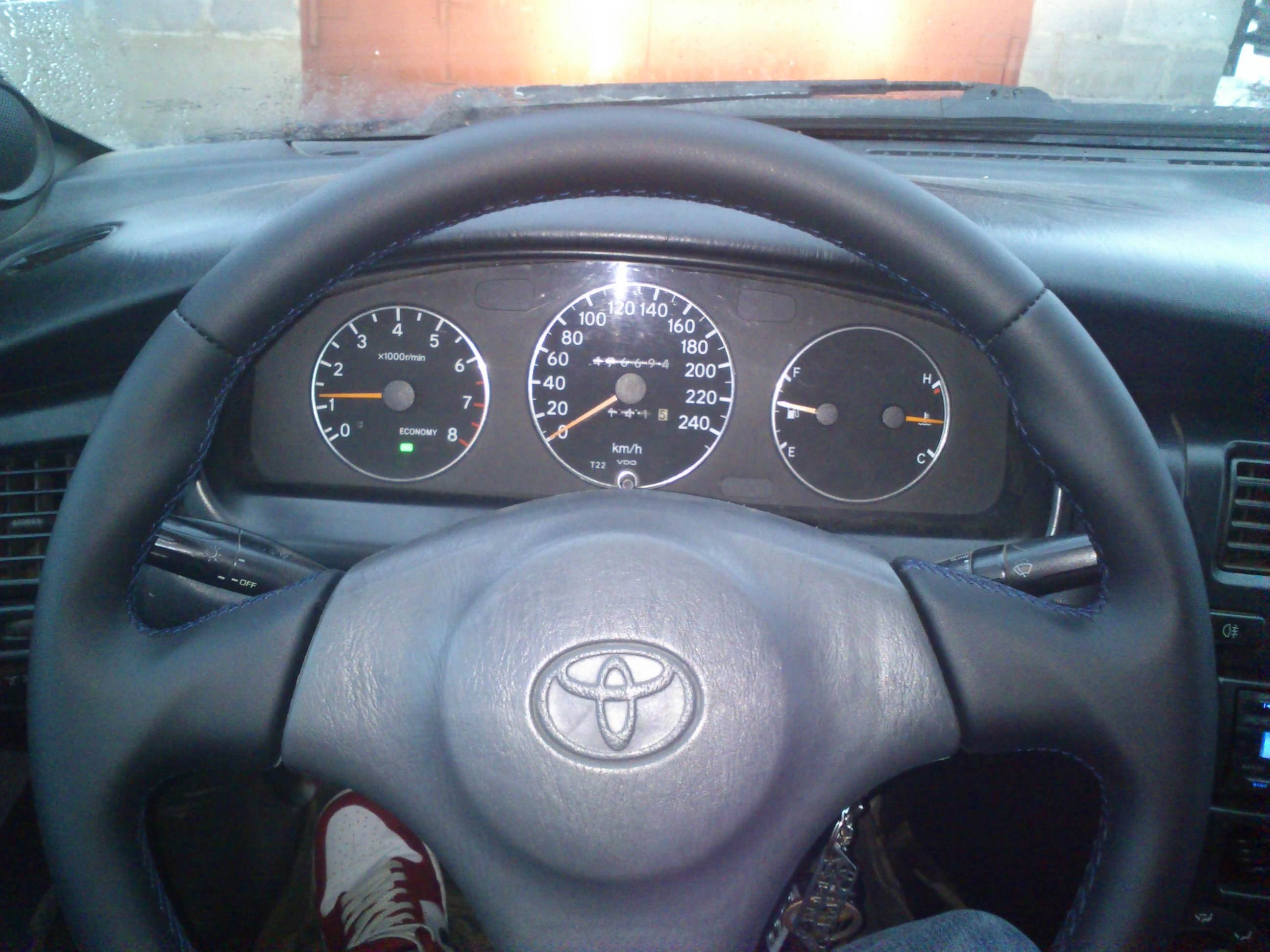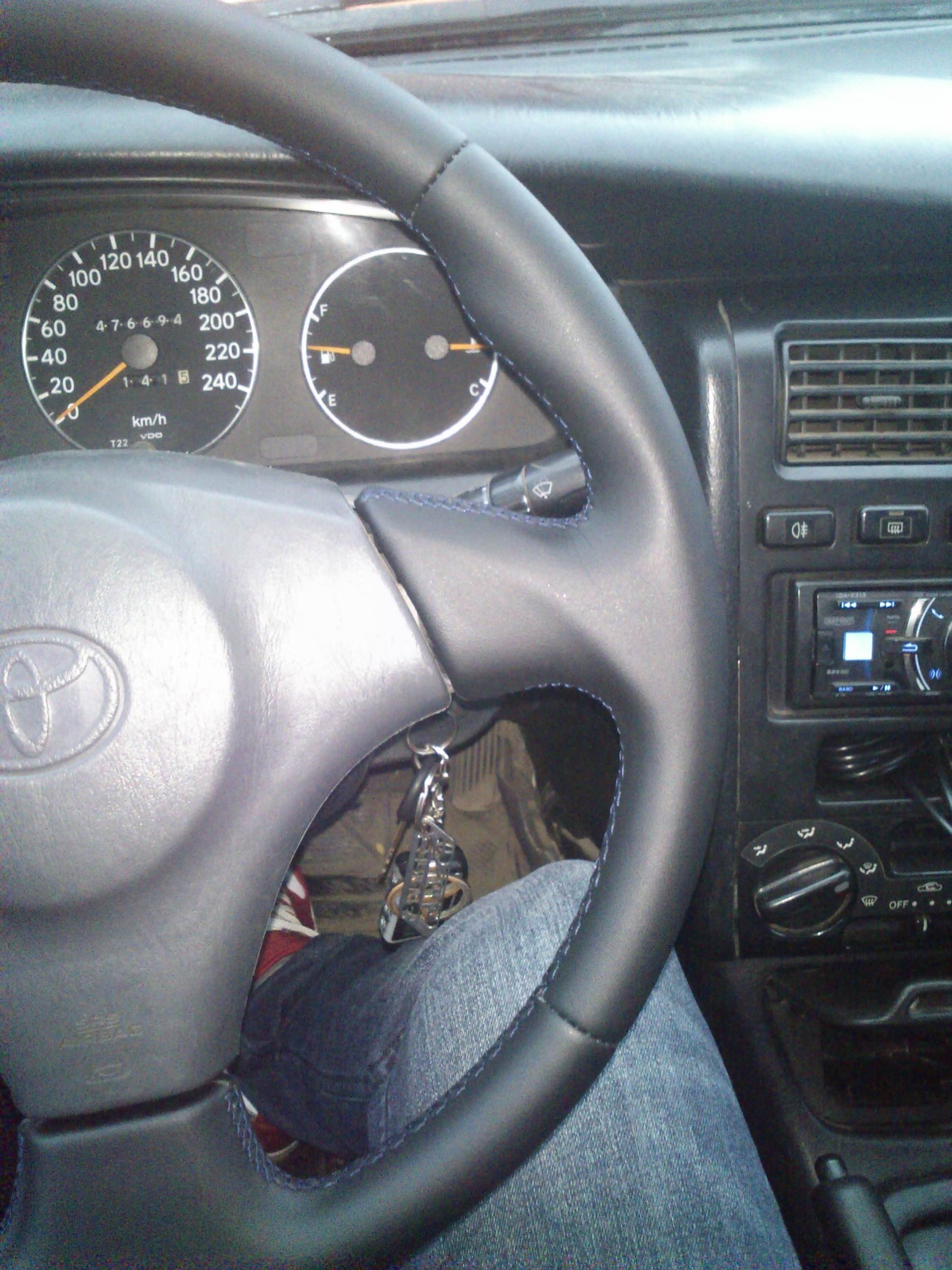 сегодня перетянул себе руль. руль с калды 215-й, такой же ставился и на супры, и на селики, и на альтезы, и на аристо, и на много еще чего покупал его года три назад в почти идеальном состоянии, за три года кожа стерлась в труху. за все удовольствие отдал 3000 рублей, зато при езде такое ощущение, что еду на новом автомобиле. качество изготовления просто выше всяких похвал, реально как с завода руки совсем по другому ощущают теперь руль  вариантов кожи было много, выбрал именно такую как и хотел. матовую, без тиснения. ЗЫ руль у меня темно серый, а оплетку выбрал черную, так как такой темно-серой в наличии не было. кстати вживую почти не заметна разница между подушкой и ободом, на фото видимо так выглядит из-за вспышки. ЗЗЫ кстати попросил нижние швы на руле опустить на пару сантиметров, так как в оригинале мне не очень нравится - высоко они расположены. получилось как и хотел - ништяк в общем