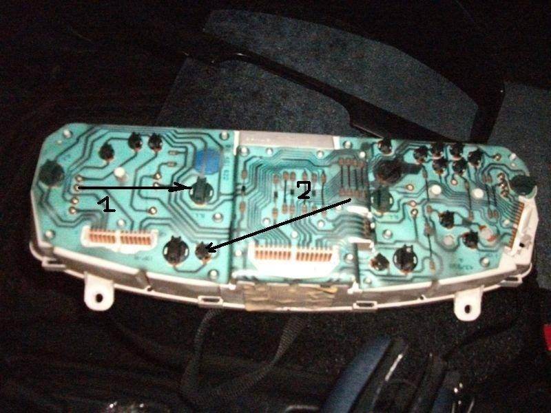как и обещал выкладываю фото. там видимо стоит зеленый светофильтр т.к. когда я поставил синие лампочки панель горит красным светом, прикольно  на фото видно, еще сфоткал приборку с задней стороны под цифрой 1 лампочки с большим цокалем, под цифрой 2 с маленьким.