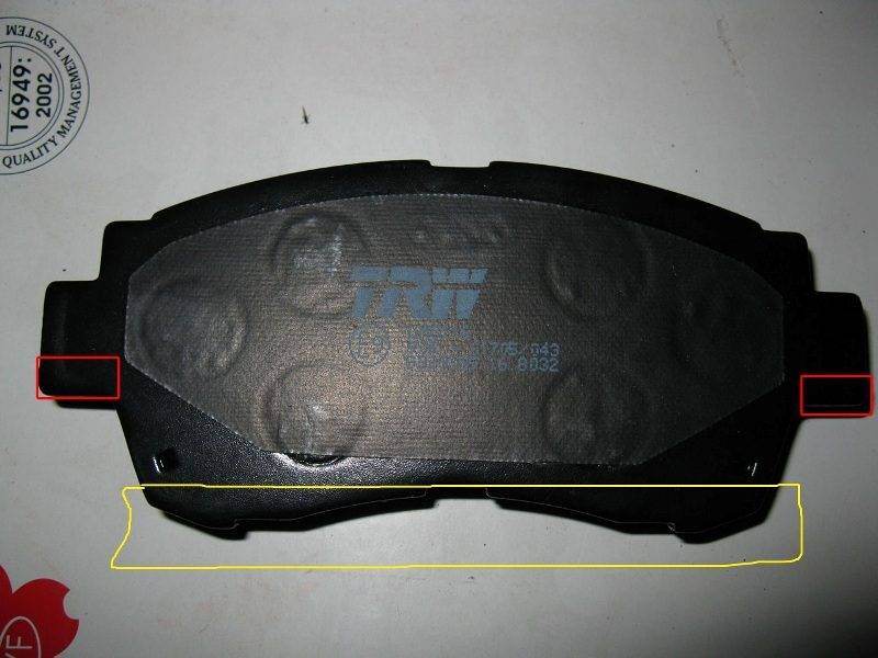 DriverНа внутренней колодке надо сточить отмеченный желтым метал до самой фрикционной накладки, на внешней этого делать не надо только ушки подправить. А так когда берешь в одну руку суппорт в другую колодку - сразу видно что, где и сколько точить  Вложение:
