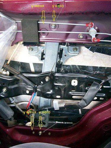 MerTVэх, товарищ, где ж ты раньше был?.. Я уж тут три дня панику навожу, а ты вспомнил, что у тебя есть два правых передних...  Теперь буду колхозить с этого, разобрать не страшно, зато хоть можно будет определиться. Еще вопрос - народ, ни у кого, случаем, не завалялись фотки заднего правого подъемника, установленного в двери, то есть не отдельно? Дело в том, что в задней двери есть несколько заводских отверстий для крепления направляющей подъемника, сейчас смотрел в ФАКе, там у человека он стоит в верхнем правом-нижнем среднем, нежели у меня. Возможно поэтому у меня и клинит стекло при подъеме. Просто интересно узнать, как у других... ПС Фотку стянул с ФАКа, не ругайтесь  Прикол этот заметил только сейчас, поэтому проверить возможности до завтрашнего вечера нет...