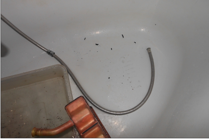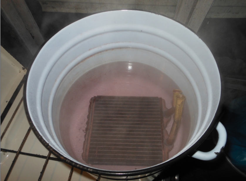 В общем, снял печку, хотел заморочиться её принудительной промывкой с насосом , не получилось  . Отступать некуда, и тем более некогда  , залил раствором лимонной кислоты во внутрь и поставил греться на газовую печку. Спустя около часа- снял и стал промывать проточной водой из под разобранного душа. Выходили резиновые остатки  , откуда они оказались? Хотя продувается легко  ... Заглянул во внутрь при помощи видеоэндоскопа, вроде каналы не забиты  , но отложения (разноцвет) всё-таки есть  ... Пошёл в магазин, купил ещё лимонки, и опять поставил на огонь, грел около часа после кипения, выключил, утром посмотрим  ... Добавлено спустя 13 минут 8 секунд:И ещё, вот что я слил уже со снятой печки  :, хотя антифриз слитый с радиатора и с блока прозрачный...