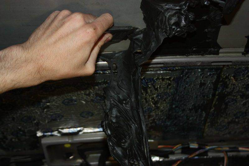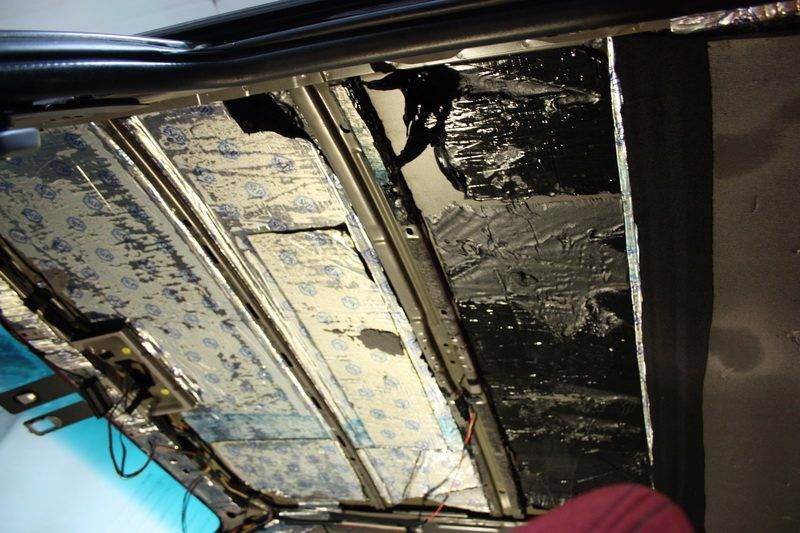 Шумоизоляция дело нужное и эфективное, при наклеивании пару раз возникал вопрос, можно ли будет её снять без ущерба для кузова? И вот потребовалось очистить крышу от вибропласта. Сначала пробовал оторвать руками тянув за краешек листа шумки, но так как клеилась шумка на совесть, ни чего не вышло только железо легко гуляло(так и крышу помять недолго). Следующим шагом был фен, разогрев шумку почти до жидкого состояния попробовал её отодрать, но кроме чёрных соплей до пола и каучуковой слякоти на потолке ничего не получалось, одним словом как жевачку разогреть и попробовать оторвать. Далее после того как шумка остыла потянул за край фольги, струдом но её удалось оторвать от липкой массы, далее думал использовать бензин и тряпки что из этого получилосьбы страшно даже представить. И тут меня осенило и решил попробовать нож для снятия тонировки, как выяснилось не зря! Очищает сразу до окрашеной поверхности и если держать его под определённым углом даже нецарапает краску. За час почистил потолок, он ровный поэтому быстро получилось, а труднодоступные места можно почистить с помощью оторванной липучки, так же как раньше в школе липучку с доски собирали и одёжку чистили. По окончании можно пройтись очистителем битума, а то заляпаной поверхность смотрится.