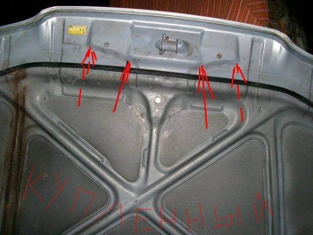 мои 5 копеек У меня англичанка 190 кузов 2с, снял свой капот и временно решил поставить от японки 7а fe, оба капота оригиналы, внешне на первый взгляд одинаковы так вот с японки после защелкивания на 2 см выше фар и телевизора, и наоборот на мой капот на японке не достает до защелкивания замка 1 см ( крепления замка подпиливали) Решение проблемы оказалась простое:несколько ударов молотком  , металл отмеченный на фото вминается и капот сел как родной, снаружи не пострадал (если капот не жалко)