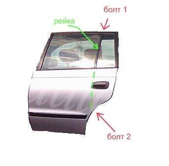 ставил только недели две назад другую дверь заднюю себе на седан , и внутренности со старой перекидывал на новую , маленькое стекло поменять так то как вариант с полным разбором , а то еще можно попробовать вариант опустить основное стекло вниз до упора , открутить болт1 , и верх рейки отогнуть в сторону руля как бы , может маленькое стекло и освободится таким методом , может понадобиться открутить подьемник и опустить стекло основное еще как можно ниже