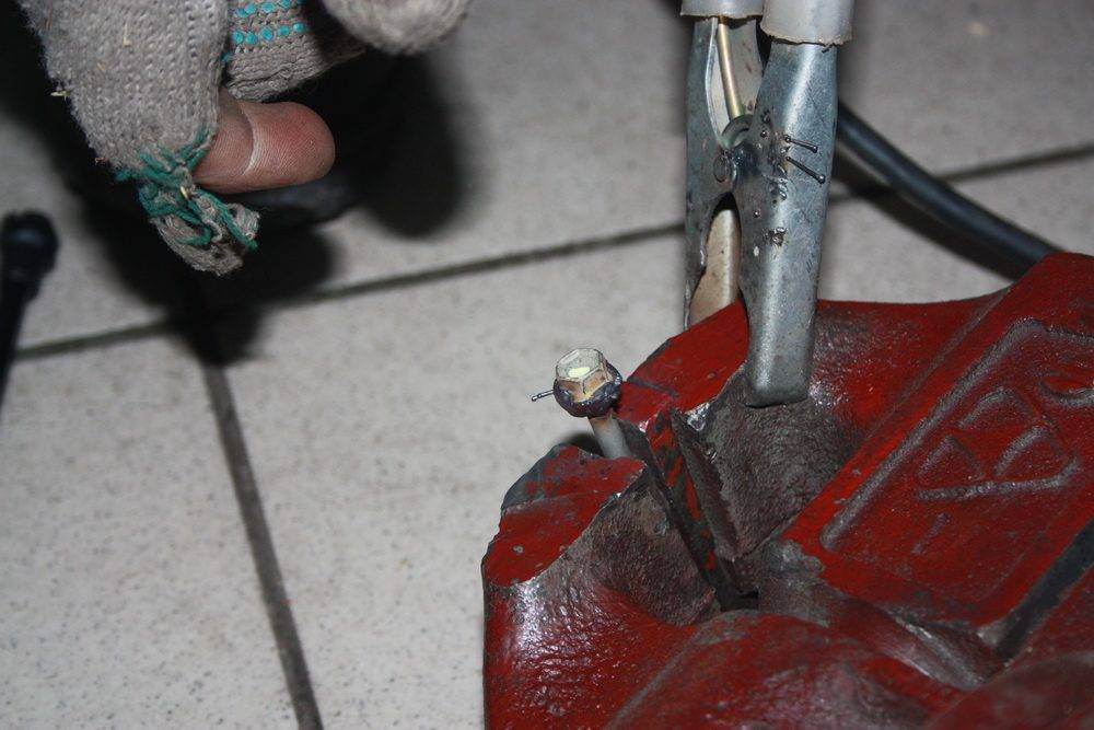 Комментарий к файлу: Зажимаем болт в тисах и навариваем на его шляпку шарик из сварочной проволки.