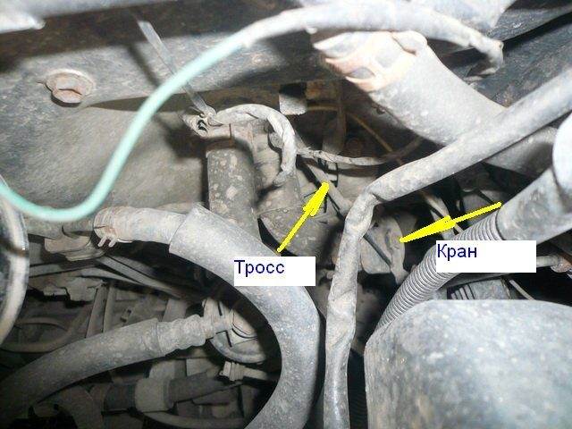 Посмотри на 2-е фото: над черным гофрированным шлангом находится кран печки, а к нему подсоединен трос. Сам кран пластмассовый и вставлен в резиновый патрубок.
