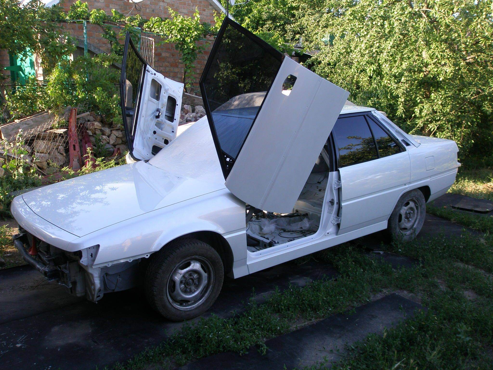 Когда то новой машина была вот такой  На станцию машину притянули из "гаражного сервиса", вот в жутком состоянии (см. фото). Это типа машина почти была готова к покраске, все ржавая внутри, гнилье замазано шпаклевкой, косая кривая. С ламбо-дверьми которые почти не работали.