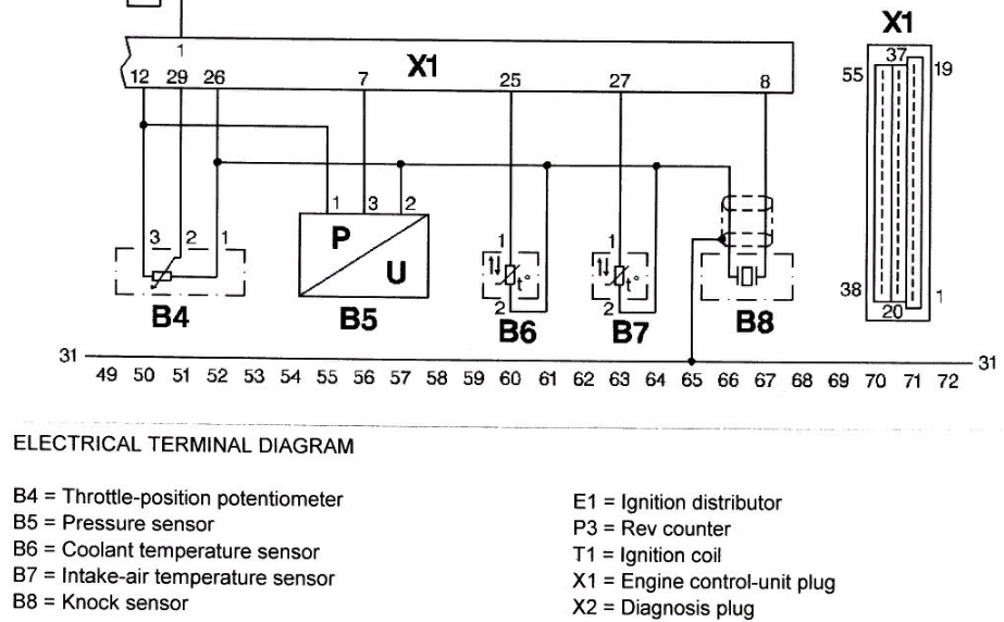 Красный провод от ДПДЗ и МАР-сенсора, плюсовой, он у этих двух датчиков общий. От ЭБУ номер пина 12. Добавлено спустя 1 минуту 45 секунд:В4 - ДПДЗ, В5 - МАР - сенсор Х1 - Разъём ЭБУ Добавлено спустя 5 минут 8 секунд:Коричневый провод минусовой можно продублировать от датчиков температуры ОЖ (не от датчика включения вентилятора) и воздуха на впуске,или от датчика детонации. Он у этих 5-ти датчиков общий ( ВНИМАНИЕ - НЕ МАССА). От ЭБУ номер пина 26. Добавлено спустя 11 минут 22 секунды:Azamat_630 писал(а): я сейчас не помню сколько там 5 вольт или 12 вольт. Пойду замерю  ... Добавлено спустя 30 минут 5 секунд:Azamat_630 писал(а): Пойду замерю ... Замерил: 5 вольт. Добавлено спустя 1 минуту 49 секунд:Азамат, спасибо за помощь! Получается дело скорее всего в разьеме ЭБУ ? Ключ и ДПКВ точно ни при чем ?