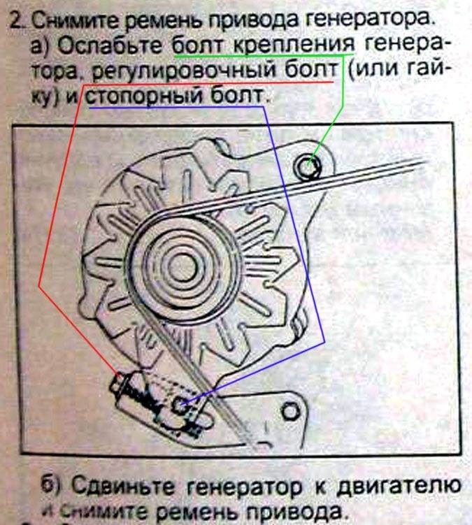 игорь08 писал(а): Как снять генератор с двигателя 2ст,машина с кандиционером. Кондишен тут не мешает, для того чтобы снять генератор нужно сделать все что написано на картинке,скинуть ремень, затем полностью открутить стопорный болт ,полностью выкрутить и вытянуть болт крепления, предварительно отсоединить провода. ВСЕ! (если заехать на яму и снять колесо-будет поудобней и побыстрее  )