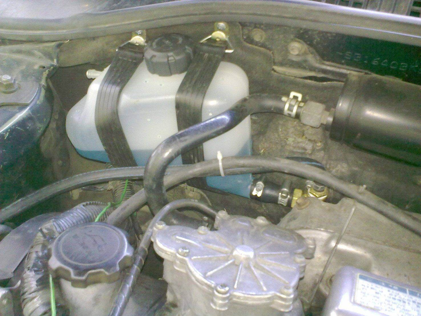 Вот и я доработал конструкцию своей каринки:D Расширительный бачок от девятки ремешки то-же, хомуты,шланги резиновые и переходники "желтые" можно купить в любом магазине\рынке по сантехнике (нужно только взять в руки новый бачок, крышечку от штатного бачка и поискать подходящие шланги). Еще понадобятся четыре стальных уголка 20х20мм, из двух делаем "петельки" и крепим ими ремни внизу, а еще из двух делаем типа "крючки" для зацепа ремней сверху. 1. Сверлим четыре отверстия под саморезы (я сверлил на глаз, сверлить дрелью под углом не удобно, сломал пару сверел, желательно маленький или угловой шуруповерт иметь). 2. прикручиваем ремни и крючки 3. собираем бачок с переходниками , переходник должен смотреть вверх.(кстати резиновый шланг большего диаметра надетый на бачок должен быть как можно короче и еще желательно со стороны переходника его срезать немного под углом и собрать так чтоб после обжимки хомутами бронзовый переходник был немного скривлен в сторону салона, у меня изначально получилось так что переходник касался кожуха турбины и при работающем на холостых движке , передавалась сильная вибрация- поэтому пришлось разобрать и переделать вышеописанным способом). 4.устанавливаем бачок с переходником и предварительно обжатым хомутом длинным шлангом (я покупал 2метра). 5.шланг проводим за\под всякими там бачками, и везде где можно фиксируем пластиковыми затяжками. 6.соединяем с радиатором: лишний остаток шланга отрезаем ножом и обжимаем хомутом. 7. ПРИ закрытой крышке на радиаторе!!! заливаем ОЖ на 2\3 бачка и закручиваем крышку бачка до упора, затем отворачиваем на 0.5 оборота- потому что: нужное давление ОЖ внутри движка поддерживает крышка радиатора и в ней есть свой перепускной клапан, через который должна свободно проходить ОЖ. 8. заводим и радуемся  Вложение: