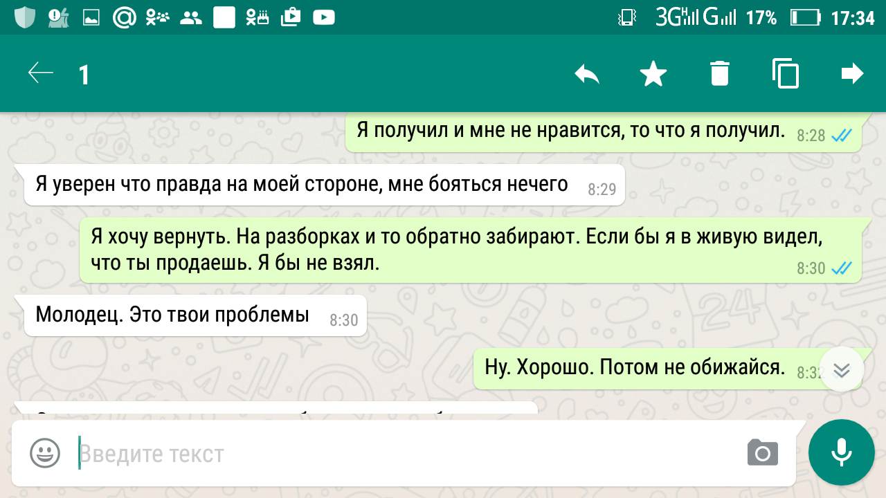 Алекс 24 писал(а): Какие ещё тебе извинения. Ты отправляешь не известно, что не смотря на состояние. Тебе нормально было написано по вапсапу забери. В данной теме мы с тобой не обсуждали ни чего. Найди хоть одну мою запись в этой теме. Я буду дальше искать, что мне надо. До сих пор ни одной внятной причины возврата я не увидел, наверно это потому что их нет. С какого перепуга тогда я должен делать возврат?