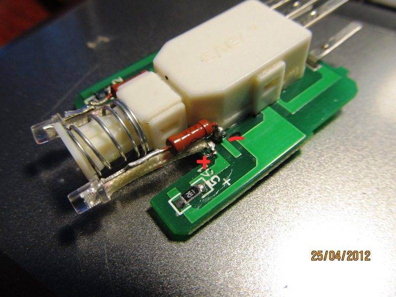 2) 2 сопротивления 0,125-0,25 Вт по 22 кОма, можно больше/меньше - яркость свечения напрямую зависит от них.