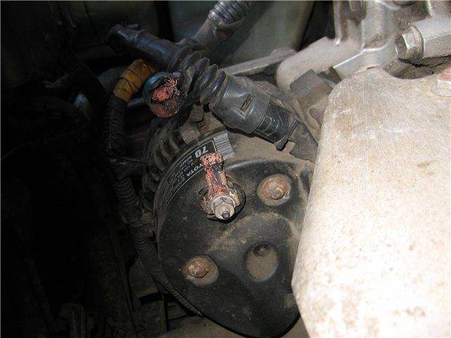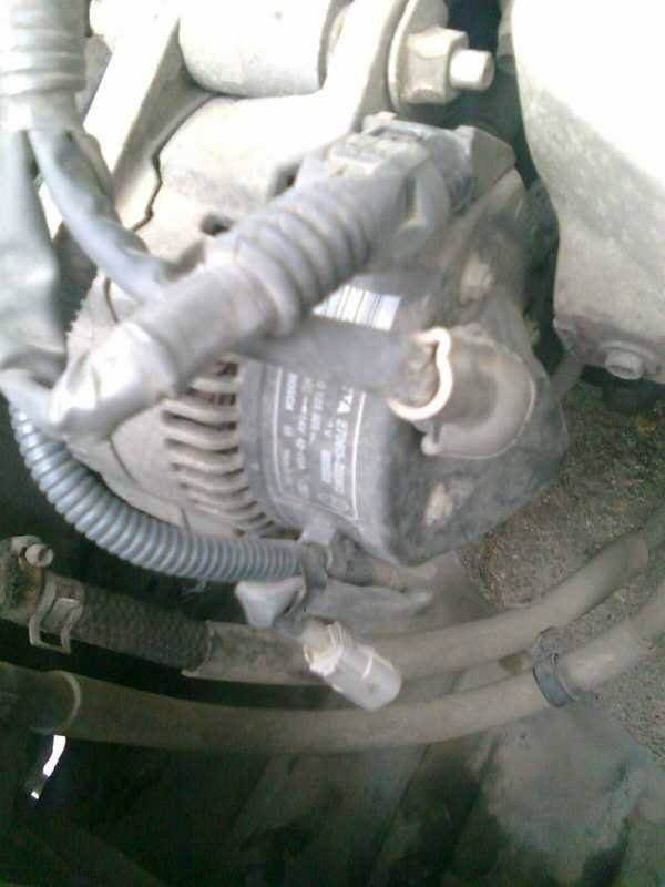 Помер сей регулятор, выдавал аж 17,5В в бортовую систему, (кто был на последней встрече видели как ярко светили фары Very Happy )а заметил я эту проблемку находясь в 60км от города, когда довольно сильно завоняло электролитом. Открываю капот а там...... этакий разъяренный колобок.....аккум вздулся, округлился, шипит и воняет сцуко. Почесал я репу, встретился со знакомым, отжал у него изрядно покоцаный генератор от авенсиса (на всякий случай, регулятора напряжения не нашлось). Обмозговоли с ним как дальше быть.... в итоге пришли к выводу что имеет смысл отключить генератор, проехаться на аккуме (что бы он подразрядился), а затем обратно подключить гену. Так и сделал..... но немного борщенул с ездой на аккуме, когда решил что пора остановиться и подключить генератор - то понял что сам уже не заведусь, а толкать как-то не улыбалось. В итоге остановился и при заведенном моторе подключил генератор............ ОЧЕНЬ сильно ни кому не советую так делать!!!!!