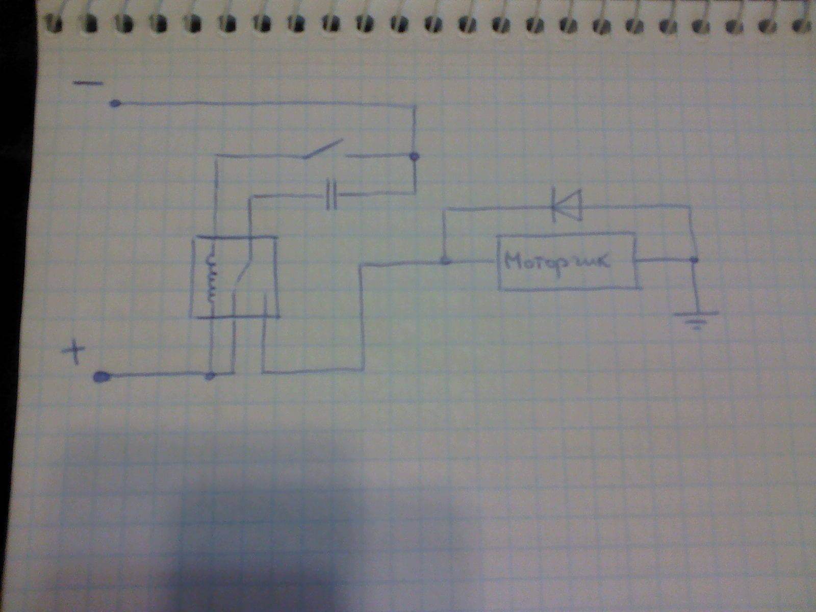 т.е. нажимаю на кнопку - питание с конденсатора идет на моторчик, кнопка не нажата - конденсатор заряжается. Не могу понять схему. Конденсатор стоит между моторчиком и реле. Если кнопка не нажата, конденсатор будет заряжаться, а когда зарядится - начнет пропускать напряжение и моторчик сработает. Разве нет? Добавлено спустя 9 минут 38 секунд:Или, получается, два реле нужно. Одно отключает конденсатор от плюса, а другое, одновременно с первым, замыкает контакт между конденсатором и моторчиком Вау - какие сложности... Кондер минусом к массе, плюсом - к переключающему контакту Кнопки,. НЗ контакт кнопки на аккум, НР - на мотор. Никаких реле не надо, можно одной кнопкой и обойтись, только ёмкость кондера вот какая подойдет - Х.З. Если слишком большой - тогда уж можно реле добавить, чтобы емкость кондера снизить, но думаю вряд-ли это понадобится.