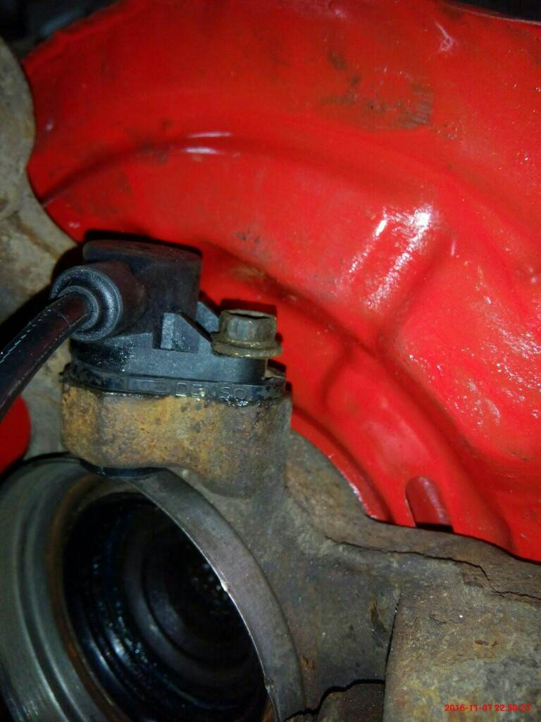 Левый передний датчик,провод между кулаком и щитком на фото видно. Продолжение отчета. вот и всё,если будут конкретные вопросы то пишите или лс,отвечу,всем удачи и отличных тормозов.  Вы спросите зачем сверлить кулак? Во первых если даже он когда-нибудь сломается то поставлю такой же,т.к оригинал точно не куплю-дорого 12к,заменитель-4,3к, а этот стоит всего 1,6к.качество датчика бош не уступает денсо,и датчик обтачивать не надо при том что при обточке его основание корпуса становиться тоньше и хрупким и можно повредить во время обработки.