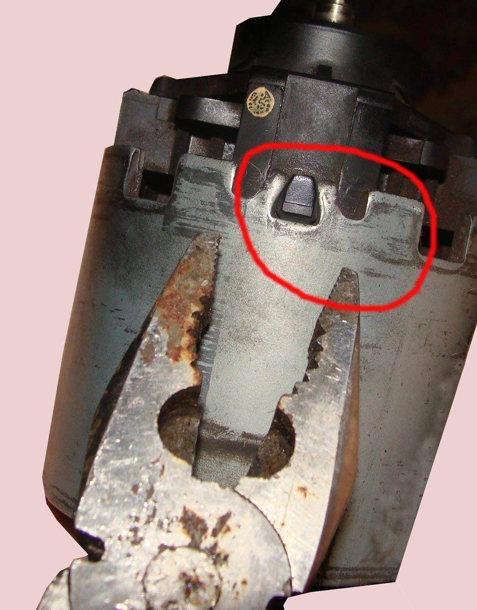 Комментарий к файлу: И так в трех местах по периметру... металлические усики на корпусе моторчика зажимают пластиковый корпус той части, на которой размещается втулка и щеточный узел. Разжать усики не смог, очень хрупкий пластик они зажимают :(