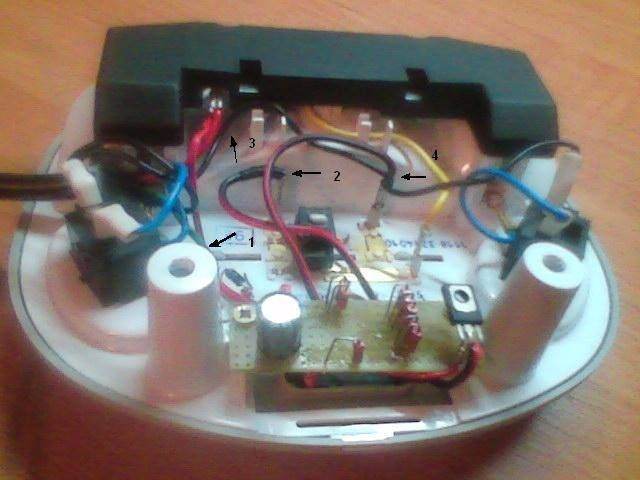 1) перерезаем зеленый провод, идущий на клемму (стрелка 2). Вход зеленого провода (стрелка 1) подключаем к катоду (-) диода VD1 на схеме. Выход со схемы на лампочку подключаем к клемме (стрелка 2).