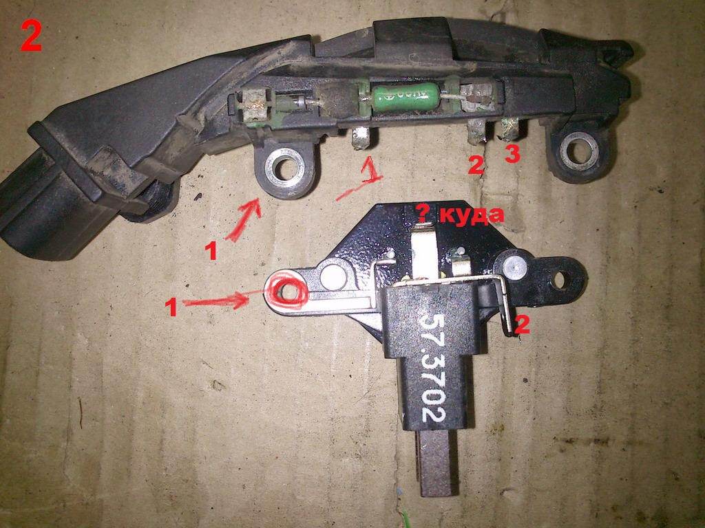 нужна помощ прочитал весь блог раза три разобрал свой бошовский генератор прозвонил всё что можно итог ни хрена не понимаю что куда припаять ? 1 клемма на массу 2 на верхнюю щётку и на (хвост) клемму с диодного моста 3 пустая ? куда от нижней щётки