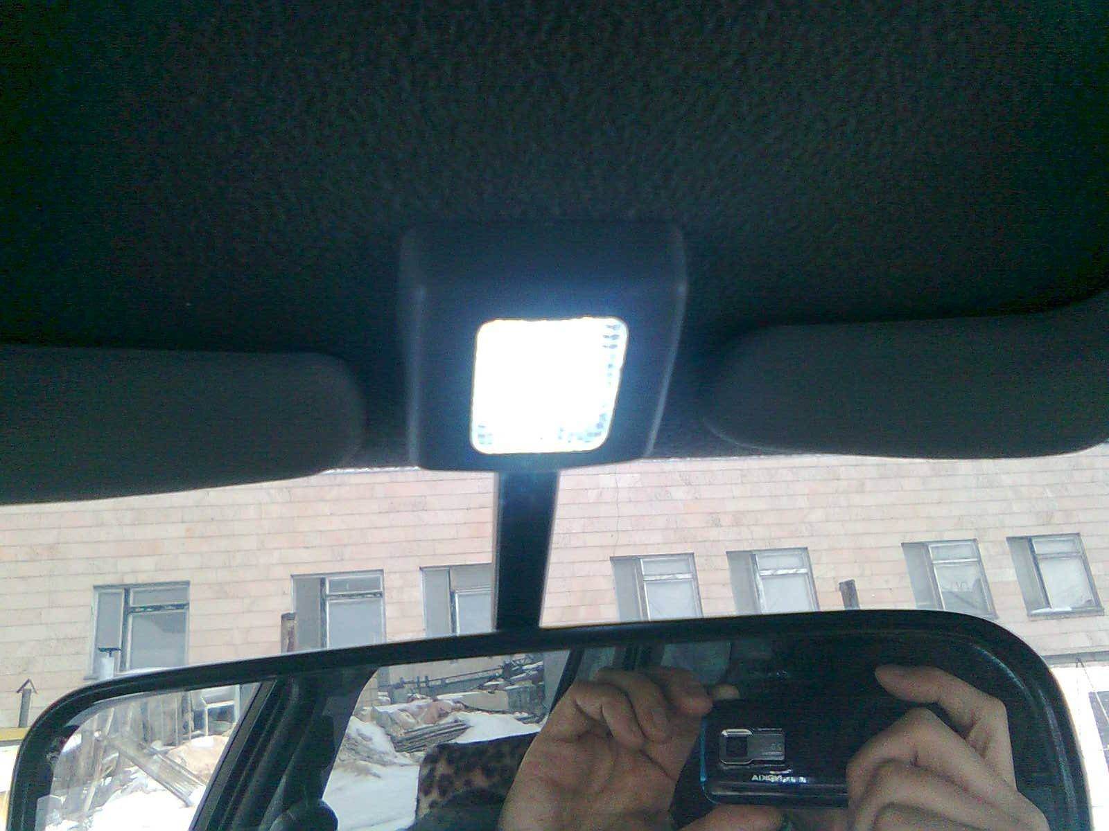 Решил установить подсветку для передн сидений в декоративной накладке крепления зеркала заднего вида. Прорезал в ней отверстие примерно 2*3 см, вклеил в него подогнаный кусок белой катафоты в качестве рассеивателя. В нише крепления зеркала, которую закрывает эта накладка установил светодиодную панель на 12 светодиодов. Питание для этой конструкции взял с разъема подсветки замка зажигания (у меня его тоже нет). На этом разъеме напряжение пропадает примерно через 4-5 сек после закрытия дверей. Также собрал простейшую схему на одном транзисторе, обеспечивающую плавное погасание света тоже примерно за 4-5 секунд.