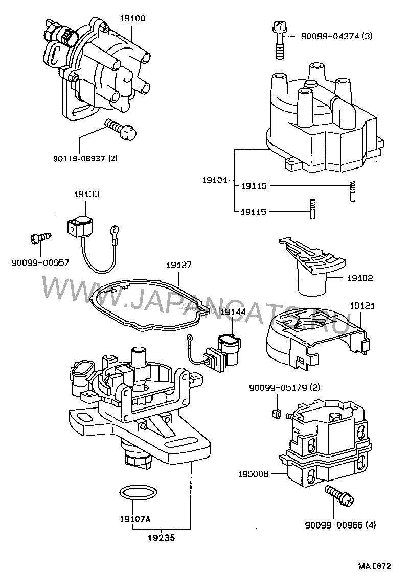 подскажите где находится датчик частоты вращения коленвалана, двигатель 3s-fe крышка трамблёра на 4 провода(катушка внутри) подскажите номер в экзисте и его цену, рисунок своего распределителя прилагаю...