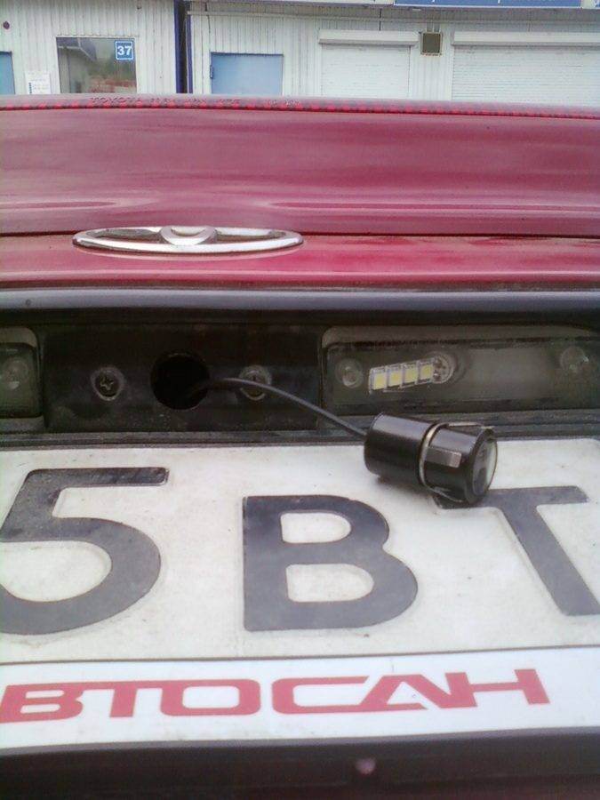 5) Теперь выпиливаем по размеру отверстие под камеру в пластиковом кожухе фонарей освещения номерного знака и вставляем камеру... что бы исключить попадание воды внутрь - обработайте все хорошенько герметиком.И получаем примерно вот такую картину: