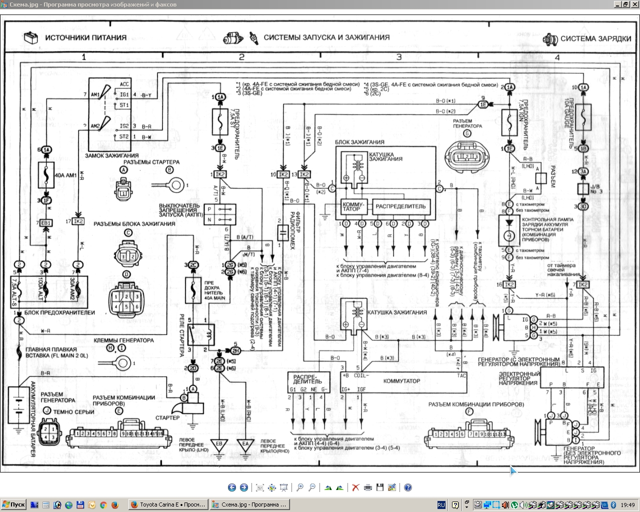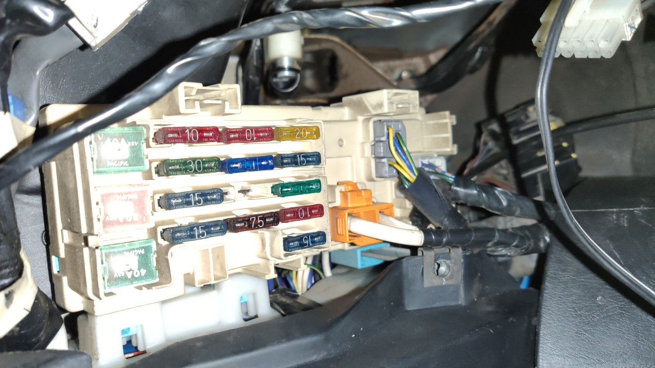 По схеме вроде, на эти два белых провода ( рисунок где слева от ног водителя) плюс приходит до замка зажигания, завтра смогу глянуть. Добавлено спустя 1 минуту 5 секунд:RGBSerj писал(а): не нашел где именно входят плюсы от двигателя. Все провода справа какие то тощие. Ну у меня на 4А так, не знаю, не хочу вводить в заблуждение. Добавлено спустя 5 минут 38 секунд:RGBSerj писал(а): Вопрос по предохранителю 7 под водительской левой ногой, тот что на зажигание. В какой момент на нем должен быть +? Ключ на положение ON, плюса нет. Или он появляется после поворота на START? Короче не нахожу на нем плюс. Сам предохранитель целый. Попробовал на него дать плюс - закоротило. Померял контролькой - на нем масса. Это не нормально же? Возможно там масса появляется после нагрузки, и это норма. Это надо иметь и грамотно прочитать схему. Добавлено спустя 1 минуту 35 секунд:RGBSerj писал(а): Ключ на положение ON, плюса нет. Контактная группа замка зажигания проверялась заведомо правильно? Добавлено спустя 42 секунды:Иммобилайзер стоит на машине?
