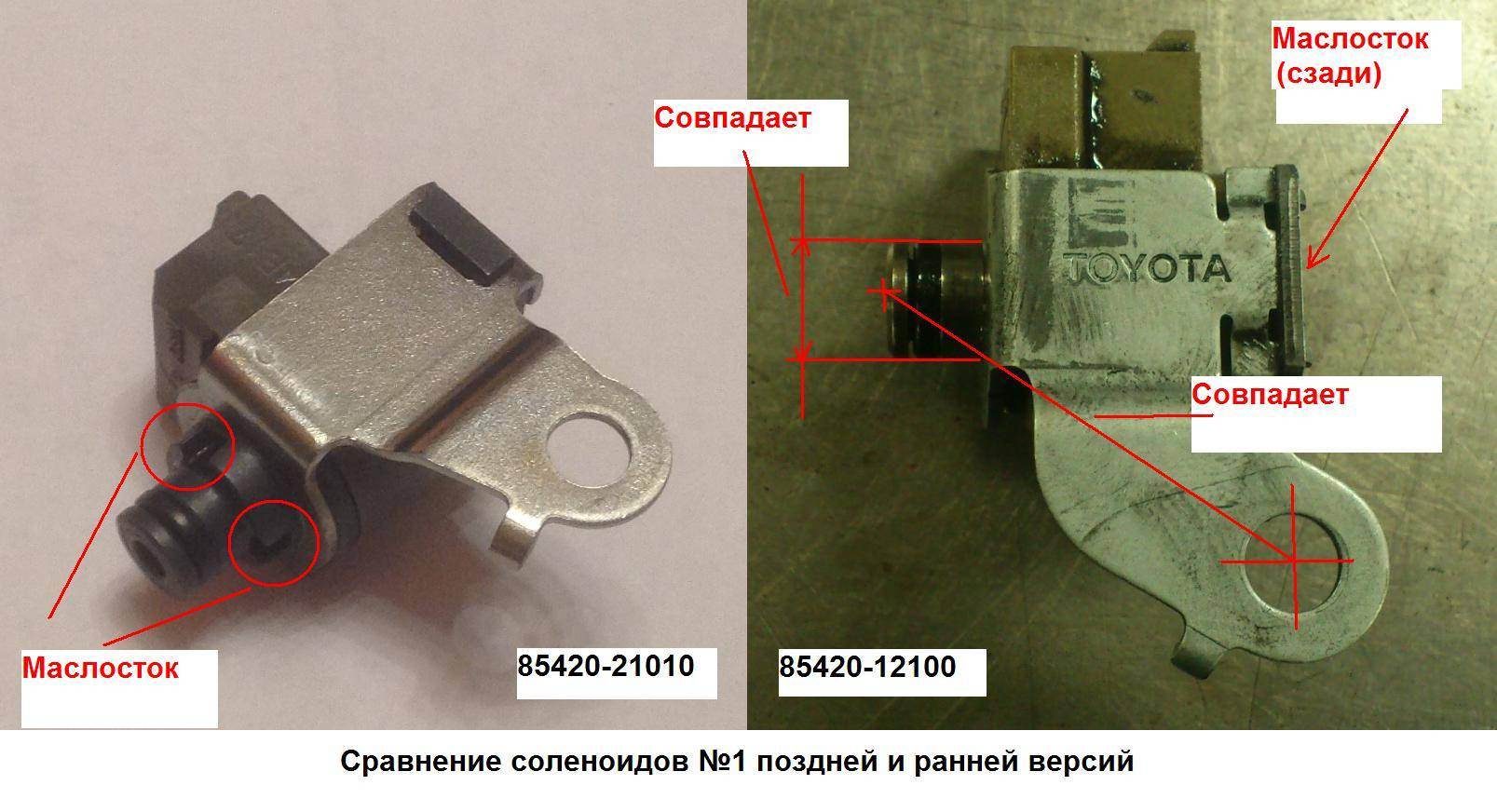 Итак, починил я автомат. Теперь спешу поделиться выводами, сделанными по ходу ремонта. Напомню, проблема была в вышедшем из строя соленоиде №1. Ковыряясь по каталогам и интернету, выяснил, что 245-х коробок ставилось 2 вида (основных). Первые - предположительно это А245Е-02а - ставились с 1992 года. Такая должна быть (и судя по всему стояла раньше) у меня. На них стоит как раз соленоид №1 под номером 85420-12100 - он бьется у меня как оригинал. Производитель соленоидов - Denso. Вторые - предположительно это А245Е-04а -ставились с 1997 года. Такая стоит у меня сейчас. На них соленоид №1 по каталогу - под номером 85420-21010. Производитель соленоидов - Aisin. А теперь самое интересное. Я специально пробивал по каталогам (брал несколько машин, типа цереса, короллы и т.п.), на "первую" ревизию А245Е бьются соленоиды №1 85420-12100, и по всем машинам на нее идет аналогом от производителя 85420-21010. На "вторую" ревизию А245Е бьются соленоиды №1 85420-21010 сразу как оригинал. Что это значит: По всем каталогам на раннюю 245 подходят соленоиды №1 и №2 от второй, соответственно, по логике - на вторую должны подходить соленоиды от первой. Вопрос идет дальше - если сопротивление у них аналогичное, то что делать с разными кронштейнами. Но оказалось, что посадочное отверстие на кронштейне у них полностью совпадает. Совпадают и размер и форма контактной части, и той части которая вставляется в маслопровод акпп. Визуально разница обусловлена тем, что у 85420-12100 маслосток находится сзади катушки, а у 85420-21010 маслосток находится спереди катушки (у входа в корпус акпп). К тому же у ранних соленоидов немного короче катушка, чем у поздних. Единственная подстава в том, что я в точности не могу быть уверенным за эти номера - так как этот номер в гугле по каринкам не пробивается. Но если верить каталогам и букварю по ремноту акпп 245е - мои рассуждения на 99% верные. Установив все это к себе, убедился что все встает болт-он. Проехав - убедился что все работает исправно. МОРАЛЬ 1. У соленоидов на 245 коробках нету пайки. У более поздних - там точечная сварка. У более ранних - хз, ощущение что просто минус катушки вставлен враспор в кронштейн. Потому что никаких следов ни пайки, ни сварки я не нашел. 2. Подержав в руках все соленоиды от первой коробки и от второй (повторюсь что обе 245 только разных ревизий), и потыкав в АКПП выяснил, что у них взаимозаменяемые соленоиды №1 и соленоид №2. Соленоид №3 (на блокировку ГДТ) имеет другой кронштейн, то есть он невзаимозаменяем. Сопротивление у всех соленоидов - 11 Ом. 3. Отличить более позднюю 245 можно - помимо соленоидов - по поддону. Он изнутри у старой - некрашеный, серебристый, а у поздней - покрашен черной краской. Сам поддон полностью подходит, фильтра на них одинаковые. 4. Вывод самый главный. Покопав гору интернета, увидел, что проблема с более поздними соленоидами от свежей 245 коробки - достаточно частое явление. У всех обрыв был именно внутри катушки. В то же время, Проблем с соленоидами от более ранней 245 я не нашел ни одной. Хз, то ли надпись TOYOTA на корпусе соленоидов делает свое магическое дело, то ли еще чего, но реально - я даже картинок с этими соленоидами не встречал, только в темах по замене ATF они регулярно мелькали. А чтобы этот соленоид и слово "не работает" было рядом - такого не увидел. Хоть перерыл кучу форумов и тем по всему инету. Насколько этот вывод верен - покажет время  Вложение: