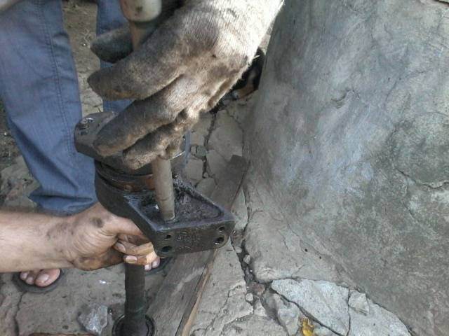 11. Теперь нам нужно сбить кронштейн. Для этого ставим палку шлицевой частью на деревянное основание, чтобы не повредить, и через проставку молотком сбиваем кронштейн.