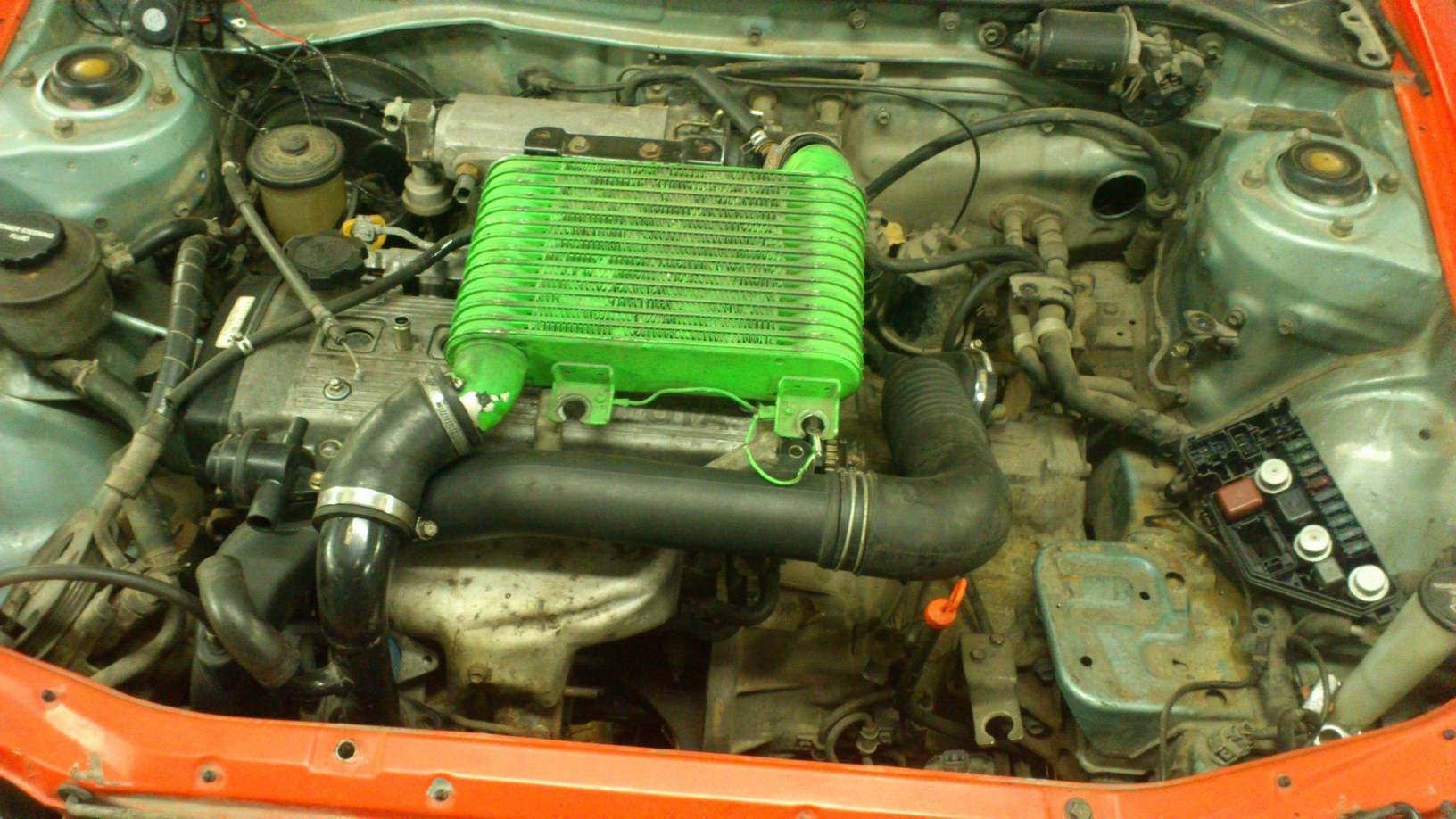 Проект был чуток заморожен,но сейчас идет полным ходом. Подробное описание на Драйве: https://www.drive2.ru/r/toyota/949252/На данный момент поставлены вкруг более мощные тормоза и поставлен двигатель. Пока все уперлось в капот,в прямом смысле  Интеркулер штатный над мотором,но это полбеды,можно б ноздрю сделать. Но там мешается все: блуофф,штатные пайпинги... Ноздря получится в пол капота  Наверное машинку ждет фронтальный интеркулер Чуть фото: Вложение: